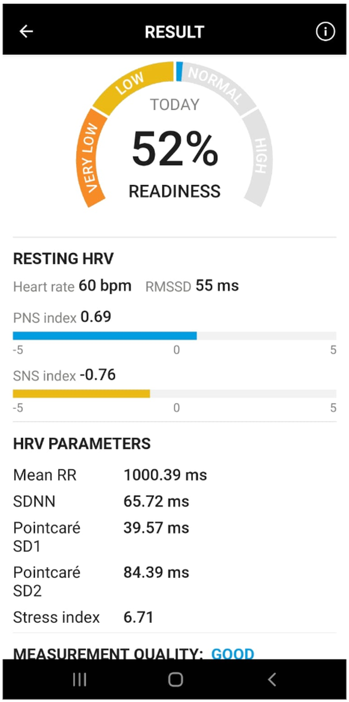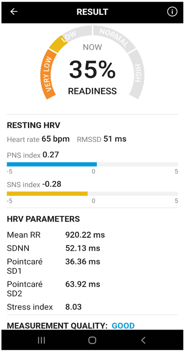 Here is player A’s HRV measurement (chest strap + Kubios app), on a morning, fully rested.