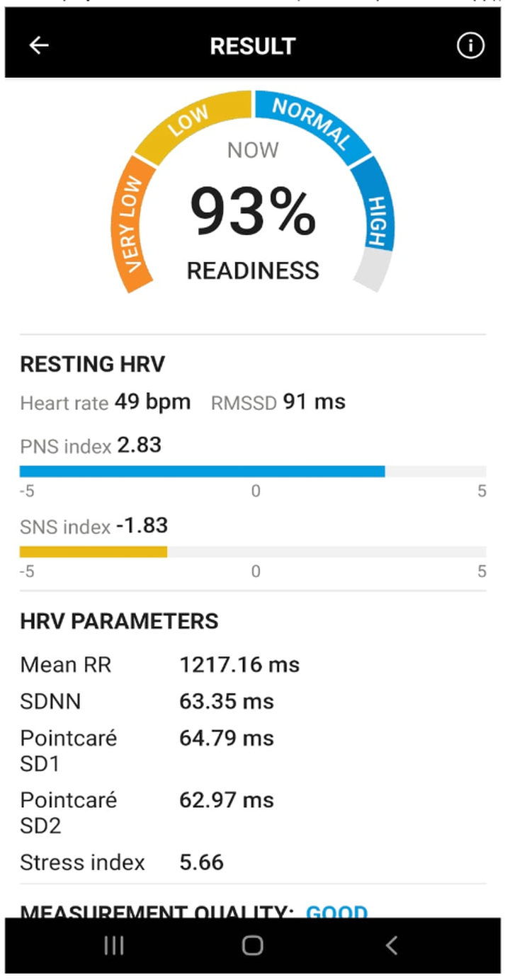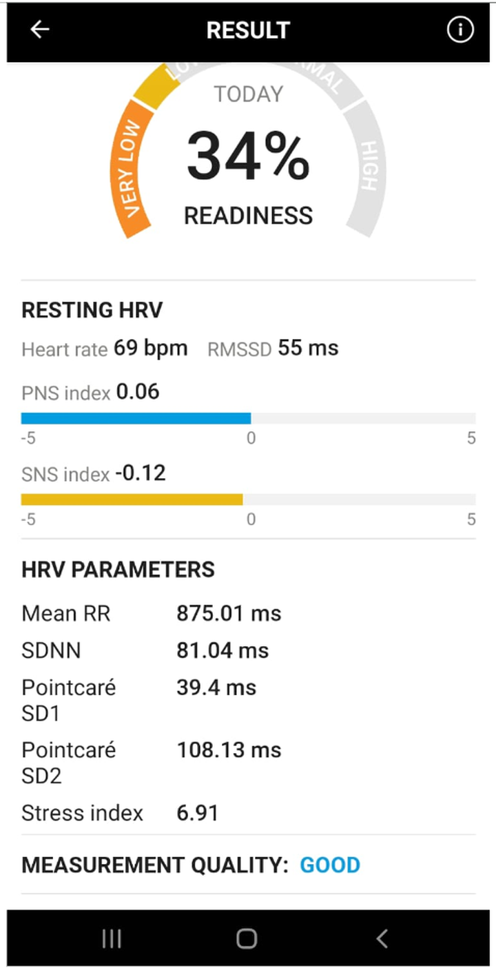 The HRV really tanked with rmSSD going from 91 to 55. The app shows a readiness score which is actually okay to use here because it’s not a blended score of sleep and other measurements like for the oura app.