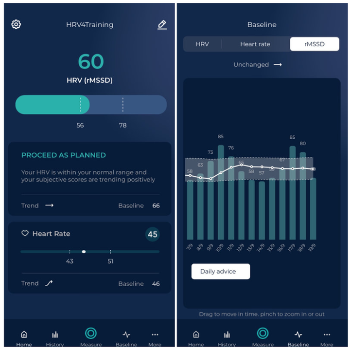 Another problem with a recovery score is that it can make you think that you should take it easy if you are tired. But maybe your training plan calls for two hard days. Maybe you need to push yourself mentally for several days in a row because that is what the competition will require. You often can’t wait for all the stars to be aligned to push yourself. This is where a real HRV measurement gives context: How does rmSSD react after several difficult days in a row?