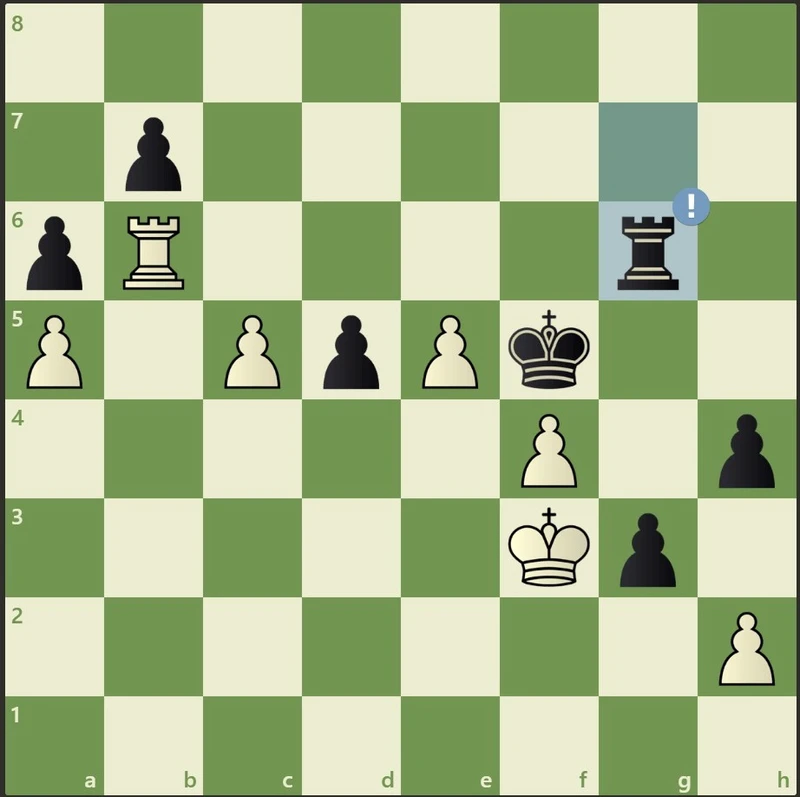 Der Weiße ließ sich hier zu 45. Txg6? verleiten, Dabei übersah er, dass nach 45. ... Kxg6 46. hxg3 h3! der Schwarze über zwei Freibauern verfügt (d5 und h3), die gefährlicher als die weißen Freibauern sind.