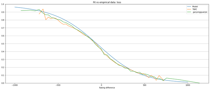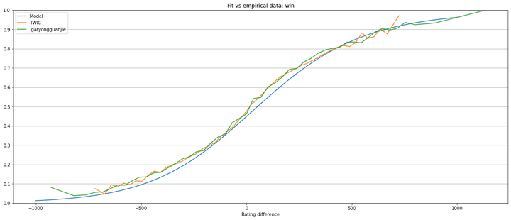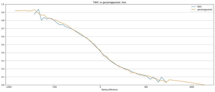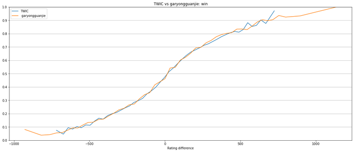 An important difference between these 2 datasets is that while garyongguanjie database ratings are chess.com blitz ratings, TWIC ratings are FIDE ratings for classic chess. Nevertheless TWIC dataset has many more games than garyongguanjie. Having more data is, in general, better for model estimation.