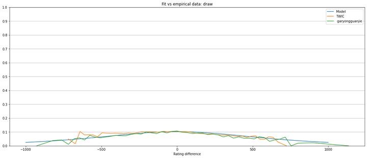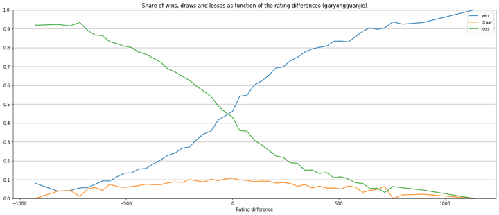 The next 2 figures show, respectively for TWIC and garyongguanjie, the empirical win/draw/loss distributions, that is, the proportion of games won/draw/lost as a function of the rating difference.