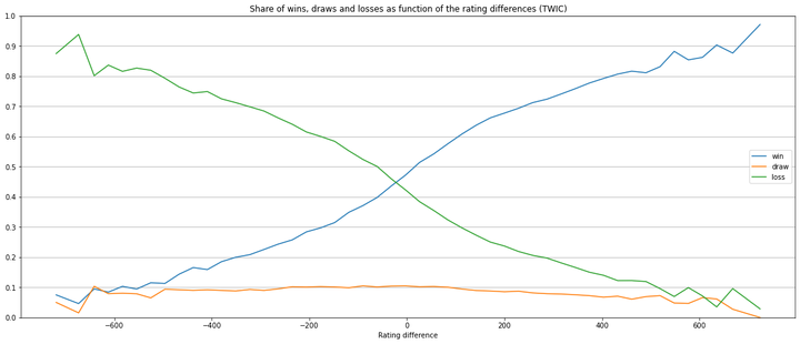 - Rating differences determine the win/draw/loss distribution.