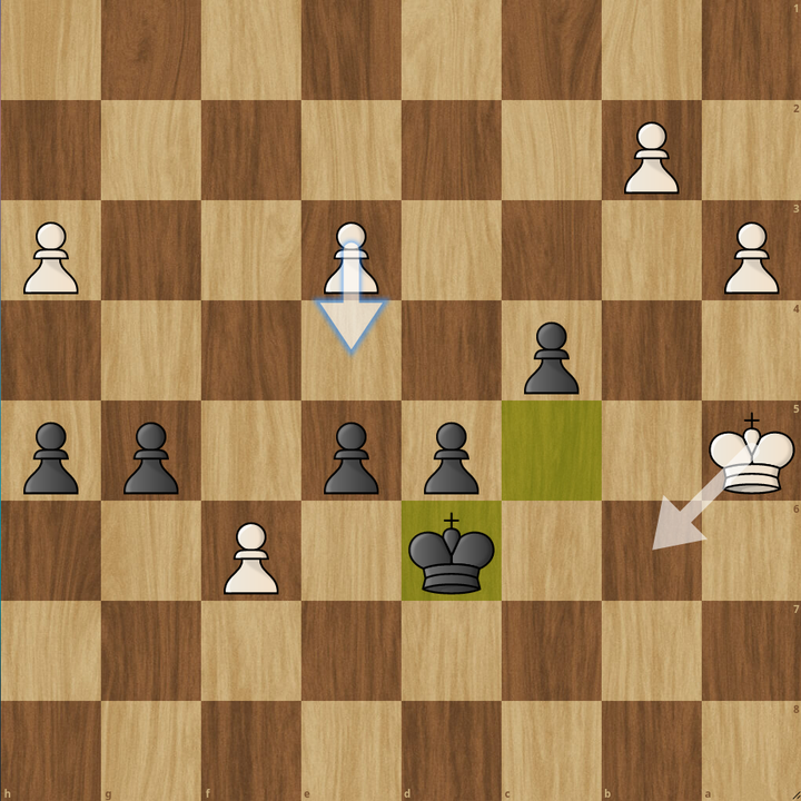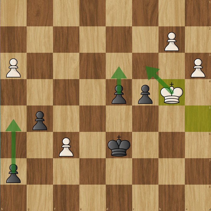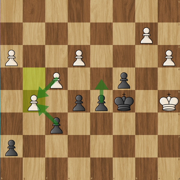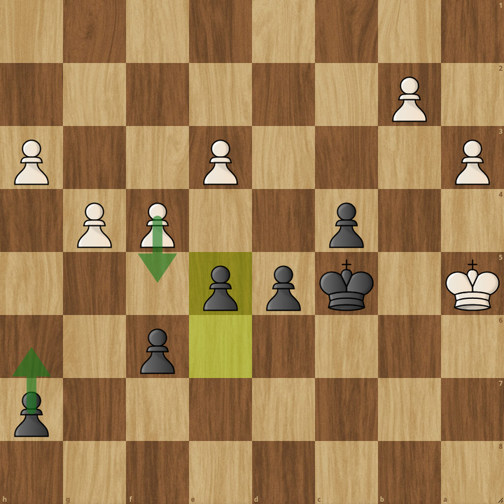 So let's first check h5, the move we were expected to play. On h5 white goes f6, and now we approach the pawn with Kd6, fairly easy. If e4, we can either take or go g4, which both win. If Kb6, we go d4 or g4 which again, both win. Same goes for Ka4, Kb4 and Kb5!