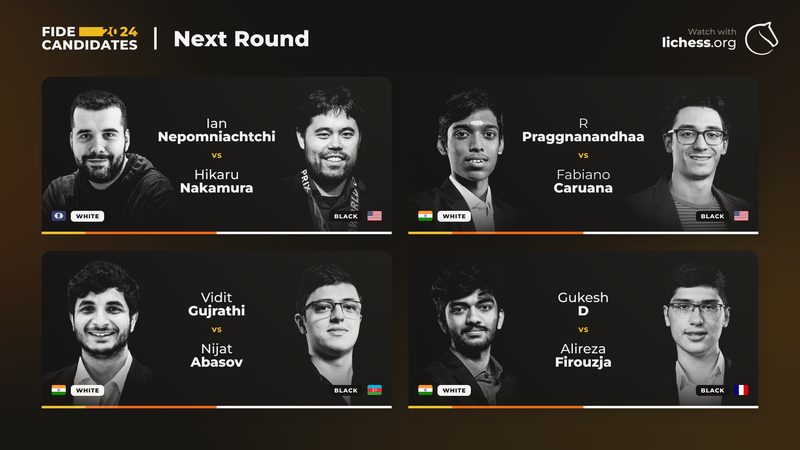 As well as broadcasting the live games from the two tournaments, Lichess is providing a live stream for every day of the Candidates. Make sure to tune in to our Twitch or YouTube channels, with streams starting from 14:15 Toronto time (18:15 UTC).