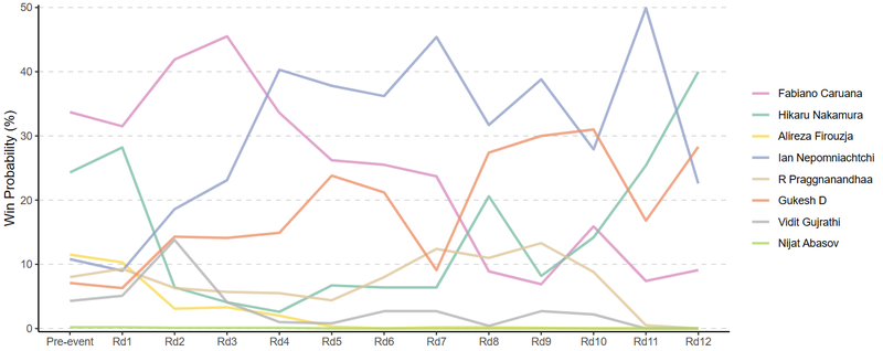 Gukesh has long been keeping pace with Neopmniachtchi, and with a pairing against Abasov this round was perceived as having decent chances due to the rating difference, despite Gukesh having the black pieces. With an early novelty in the Nimzo-Indian, Gukesh created long term positional headaches for Abasov with a horrific pawn structure. However, Gukesh’s own knight was cramped for a long stretch of the game, confined to the back rank. Nevertheless, Gukesh managed to free his knight and make use of the greater positional advantage, and eventually ground Abasov down in the endgame into a completely winning position — racking up a full point and putting Gukesh back into the joint lead, also on 7.5 points.