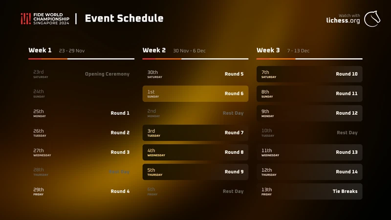 GM Ding Liren returns to 1.d4, with the two players navigating near-perfectly a less common London transposition and getting into the rest day with a draw.Lichess is providing a live stream for every day of the world championship. Make sure to tune in to our Twitch or YouTube channels for live stream coverage with our hosts GM Felix Blohberger and IM Laura Unuk, joined by a rotating panel of guests. Round 7 starts at 09:00 UTC on Tuesday, December 3.
