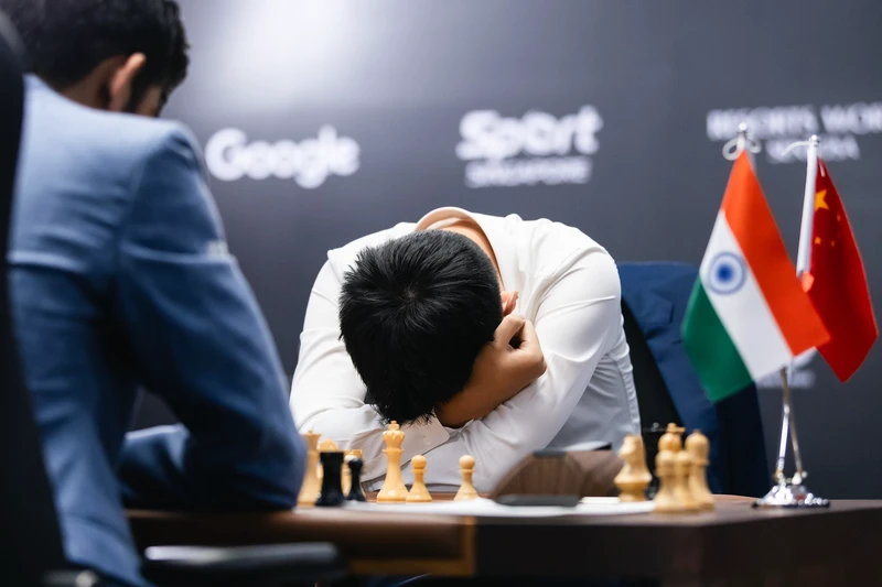 After trying 1.e4, getting into an Italian in Game 2 and 1.Nf3, getting into an uncommon line resembling a reverse Queen's Indian Defense in Game 4, neither of which led to a decisive game, GM Ding Liren decided to try 1.d4 against GM Gukesh D for Game 6, with the two players getting into a London System line.