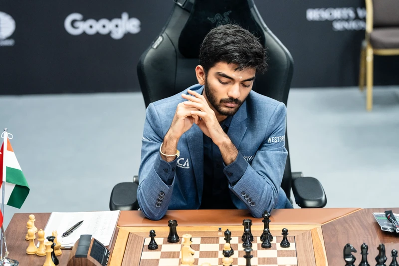Gukesh deciding his next steps, moments before exchanging the last minor piece
