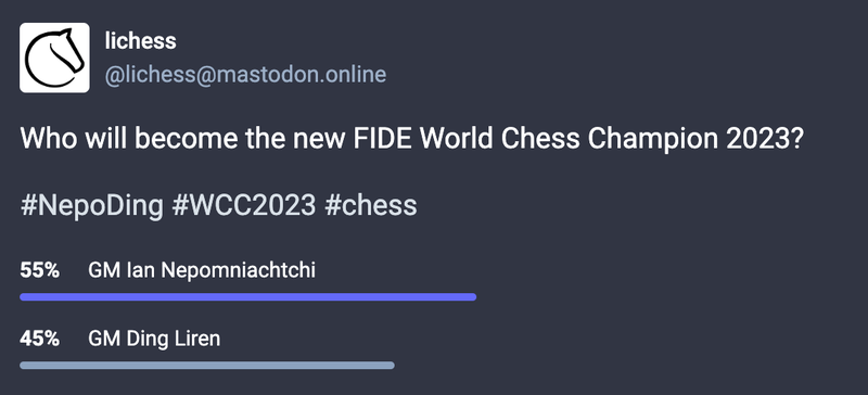 Prior to the match, Ding had been considered to be somewhat of an underdog -- although least so by the Lichess Mastodon community who thought the match up was pretty equal (clearly showing the supremacy of FOSS communities :P).
