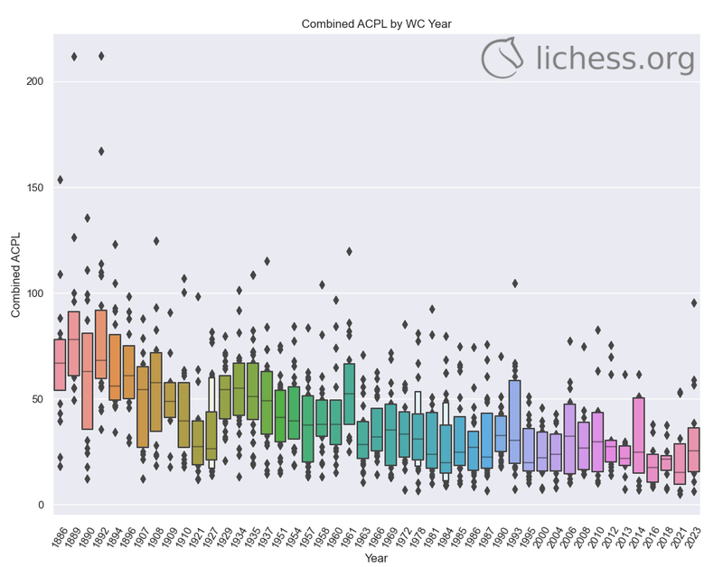 The boxes show the average range of accuracy, with the dates corresponding to the World Championship played that year. The diamonds aligned vertically show the outliers at both extremes.