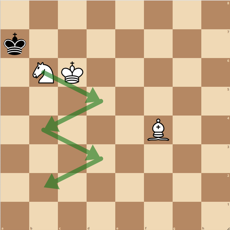 Ведем короля, слона и коня в центр, оттесняем ими короля соперника, король идет в угол, противоположный цвету слона, так как там мат не ставится. Доходим до вот такой расстановки, где конь атакует угловое поле а8.