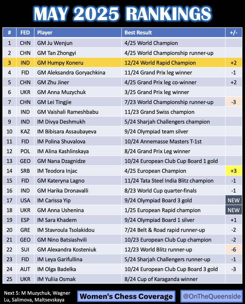 May Top 25 Women's Rankings: Somehow Humpy returned!