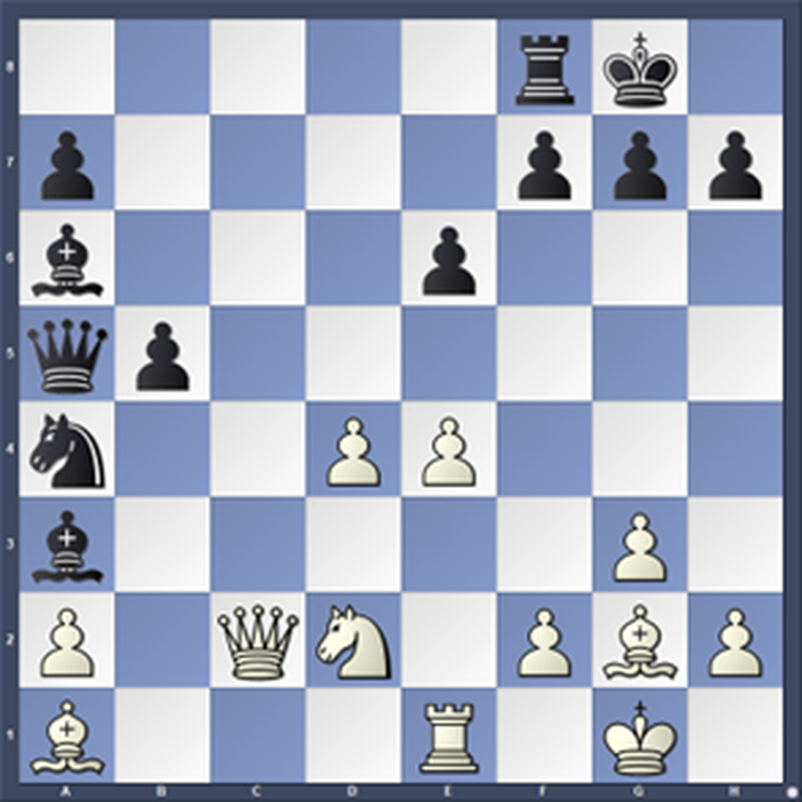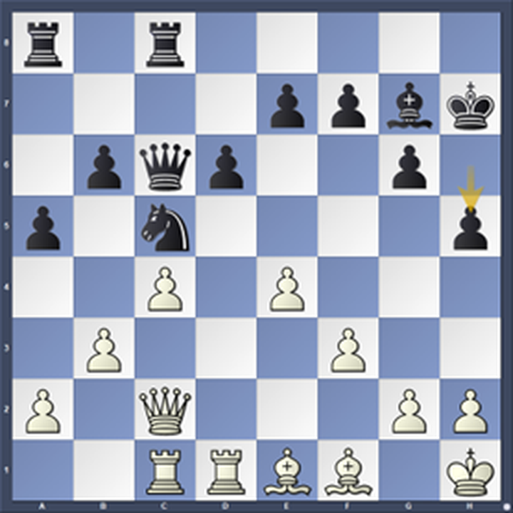 Hier had ik echt zin in het esthetische 25.Db1, wat een acceptabele zet is, maar niet de beste (dat is misschien Lf2, maar er zijn ook andere kandidaten), maar ik koos tenslotte voor g3, wat net als Db1 een gelijke stelling oplevert. Dergelijke geometrische patronen vallen me wel vaker op, van “paardenvierkanten” en “pionnenvierkanten” tot andere bijzonderheden.