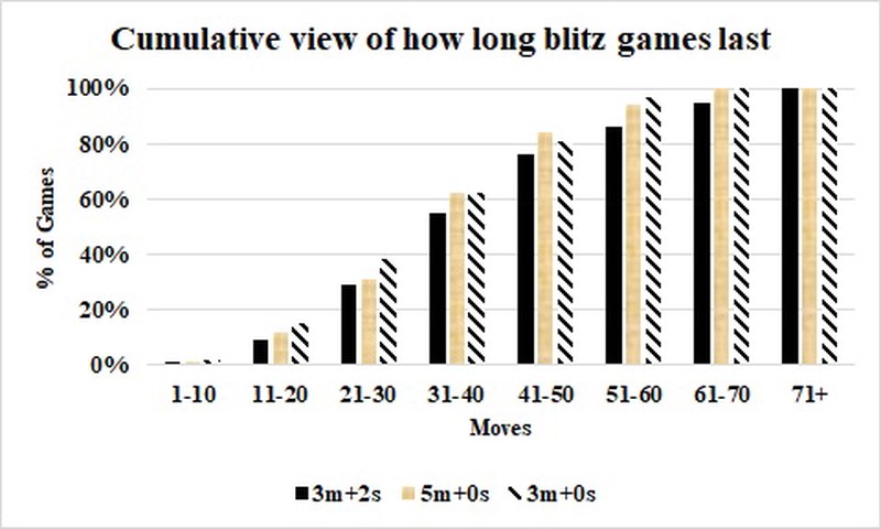 So how many moves are we likely to need to play? I took samples of 100 Lichess arena games from mid-level Lichess Liga tournaments at different speeds and charted the distribution of game lengths, firstly as a basic percentage frequency and secondly on a cumulative basis.