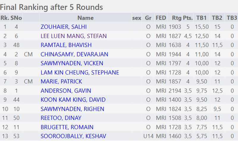The tournament was convincingly won by Zouhaier Salhi (Tunisian origin) with a perfect score of 5/5, defeating strong players like CM Chinasamy and 4-time Mauritius Champion Gavin Anderson.