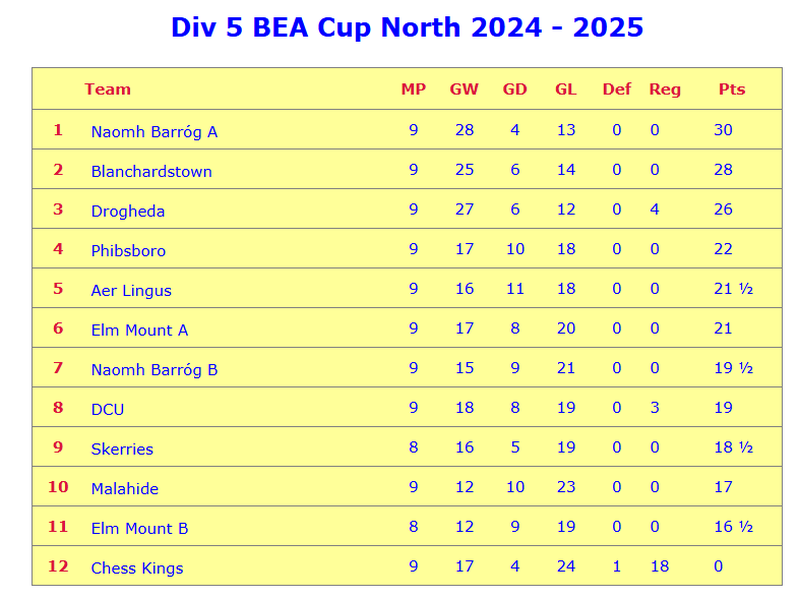 Our battle to win the local chess leagueI previously wrote about the experience of my local club, Naomh Barróg, to win our local chess league here in Ireland. We're only a small club with 30 active players, so winning the BEA Cup North, which is division 5 of the Leinster Leagues, would be a great achievement.