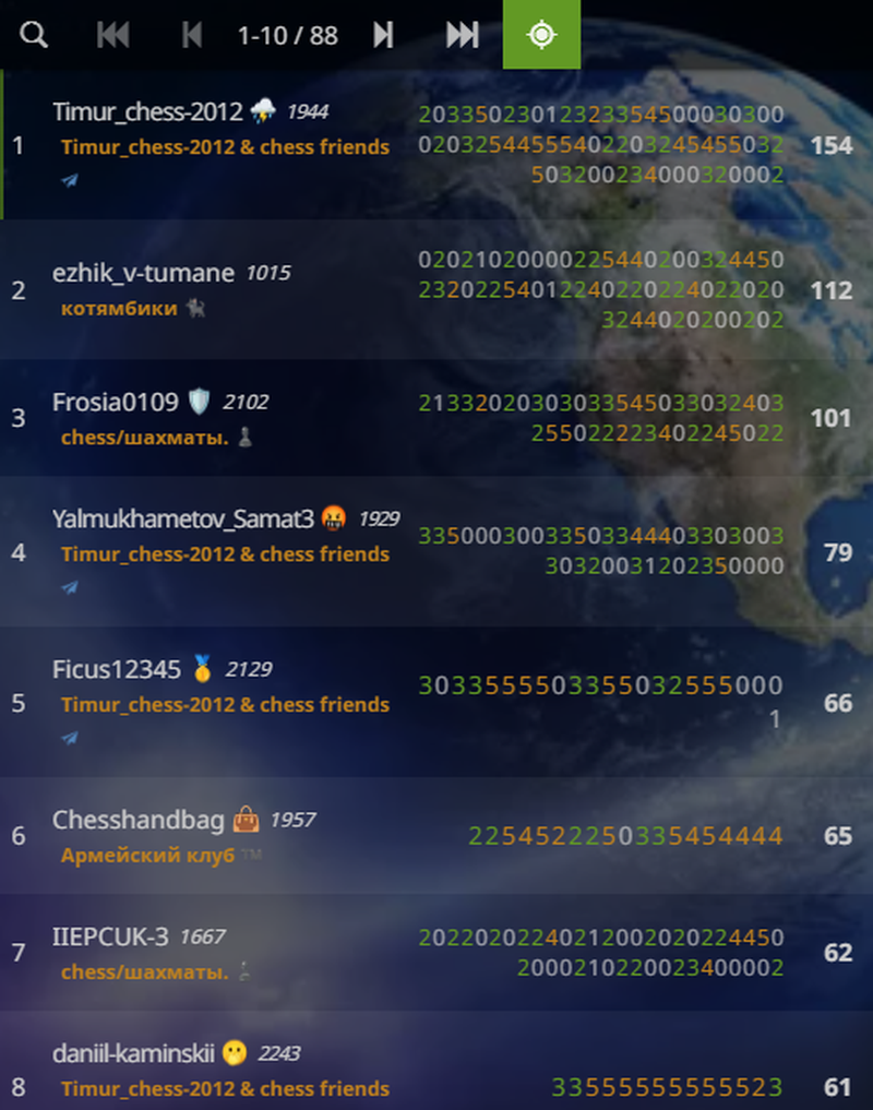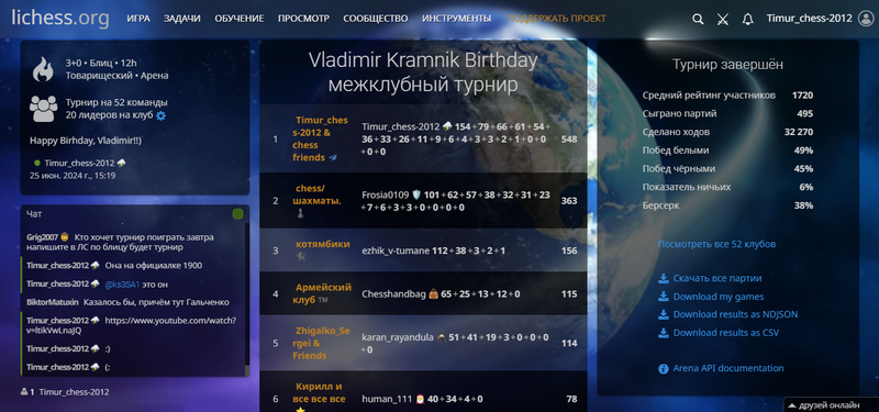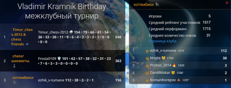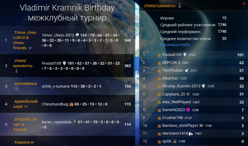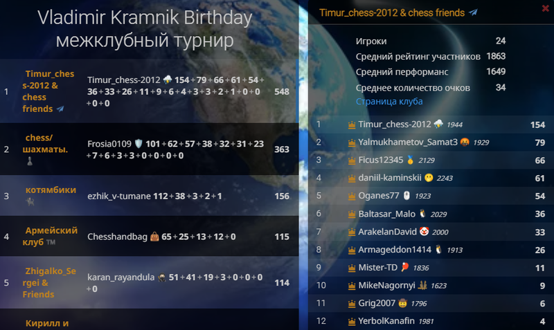 "Тот, кто готовится к войне, гораздо ближе к победе чем тот, кто уверен в мире" - Китайская мудрость25 июня 2024 года был День Рождения 14-ого чемпиона мира Владимира Борисовича Крамника. В честь этого, я решил провести 12-ти часовой мини-марафон в честь этого. Зарегано было 52 клуба, но присоединись люди только в 18 клубов, а играли только 11 команд. Но битва была интересная, учитывая то, что первые 30-40 минут мы шли первые, но потом клуб СШ (chess/шахматы.) нас перегнал и я думаю: "все.. вот и приплыли.. конец нашей победы", но случилось чудо: два игрока с рейтингом 2200 и 1900 ушли, остался Фрося (рейтинг 2100) и парочка 1600 ( @IIEPCUK-3 и @Nicolay_Kuzmin-2013 ). Мы начали обгонять после подкрепления - пришел Даня Каминский (рейтинг 2300), Стиф ( @Ficus12345 рейтинг 2100) и Миша (мой друг, вместе с ним ходим на шахматы рейтинг 1700). Я думаю, что случилось??? Потом Фрося вырубил стрим и сам вышел из турнира. Мы обогнали на 50 очков, потом на 100, далее на 150, и в конце концов на 185 очков, когда и закончился этот прекрасный турнир!