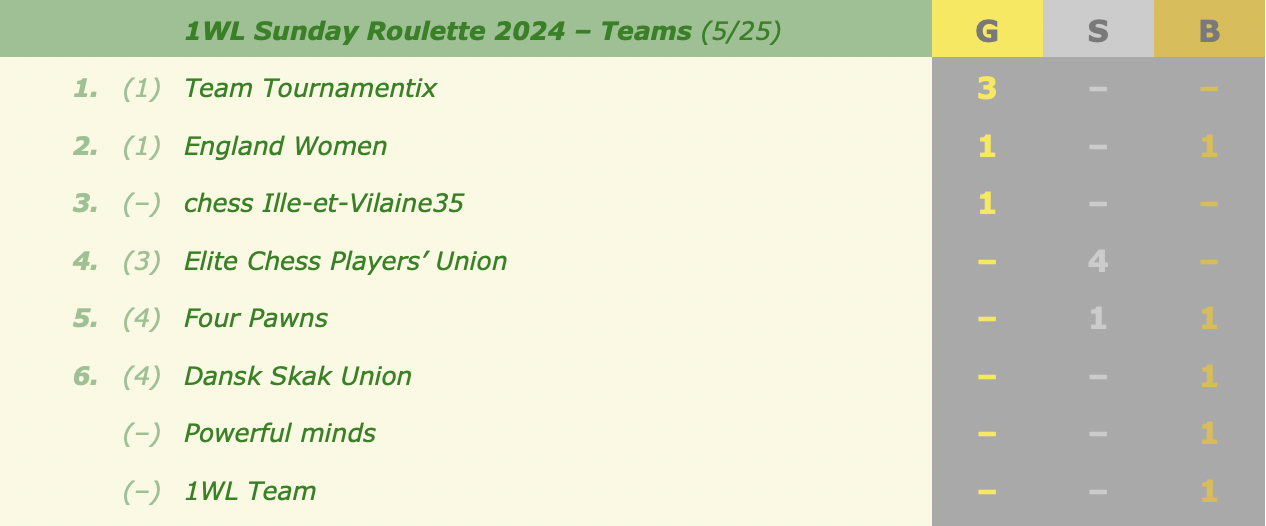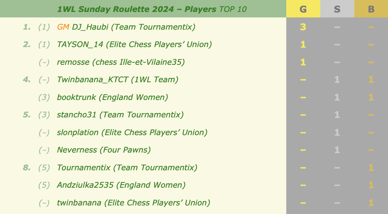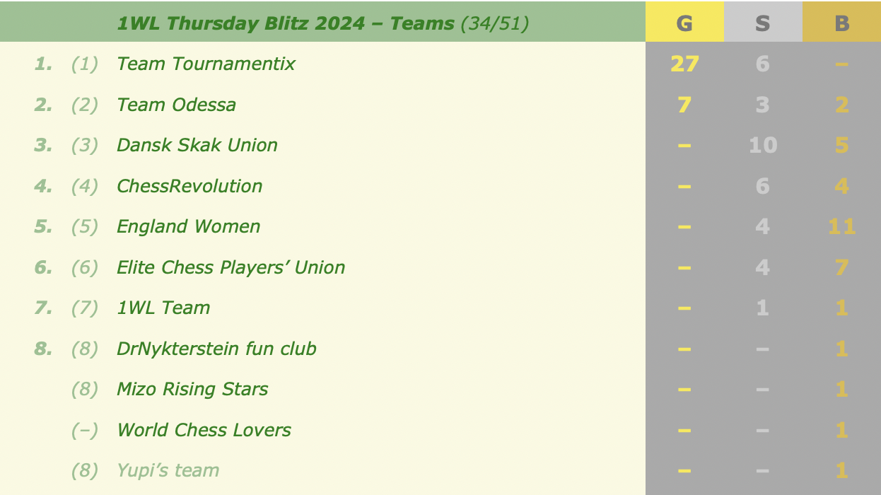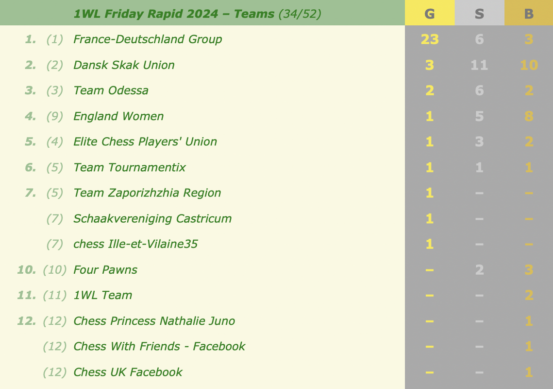 Last month's medals and overall standingsThis week's events (all at 18:30 CEST):