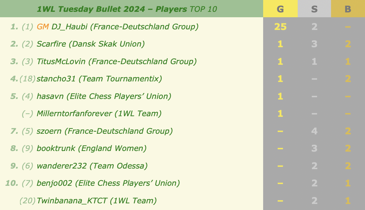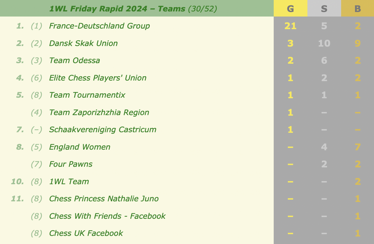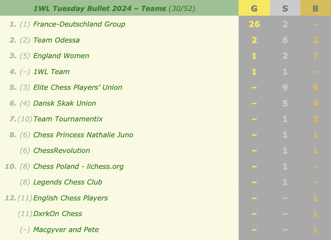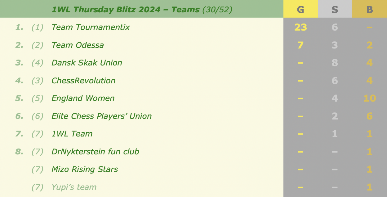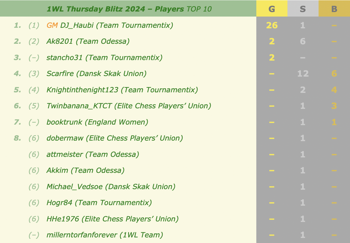 Last month's medals and overall standingsNext week's events (all at 18:30 CEST):