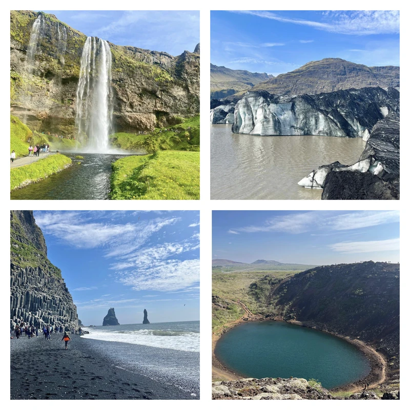 top left corner: Seljalandsfoss | top right corner: Sólheimajökull