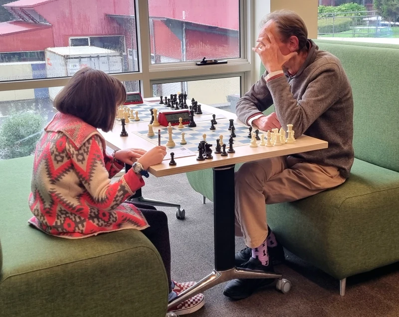 Zoe Meredith, who missed out on a prize for coming third in the Australian Under 10 Girls Category, playing Hobart Chess Club President, Chris Shepherd