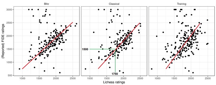 I just saw this posted (below) on one of the Lichess community blogs. It does confirm one of the graphs above where a 1750 Lichess rating is equal to a 1500 FIDE rating. Very interesting: