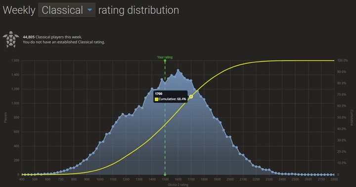 Since I don't have a rating, Lichess assigned me a provisional rating of 1500. Looks like the average rating is 1550 for Classical play. If I have a 1700 rating, the curve says that I play better than 68% of Lichess Classical players (at least for last week).