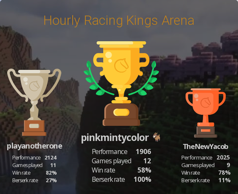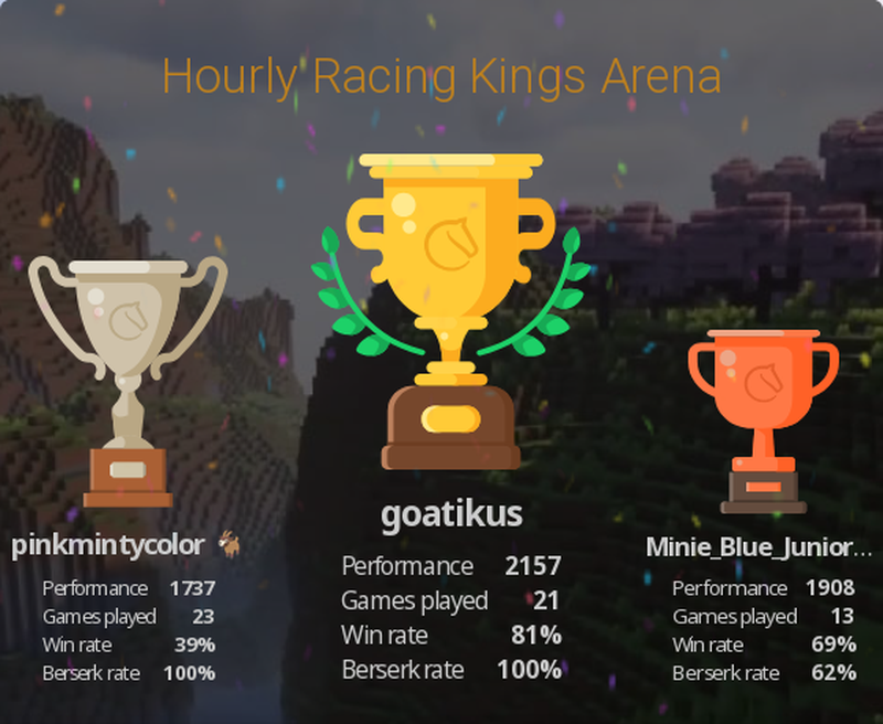 The variant Racing Kings. I started out with my lowest rating, 1392 on May 1, 2025 ,12:02 pm in this tournament: https://lichess.org/tournament/8PeF0kUA which was 3 months ago. I was just starting to play some different variants of chess. I was getting fond of bullet, but then I went back and played some more Racing Kings, suddenly I was winning, my elo climbed up. And then, for the first time ever, I got 2nd place in a tournament with my new rating of 1508! My heart was pounding with excitement and joyful moments, I was so happy! https://lichess.org/tournament/tbjfbOMD