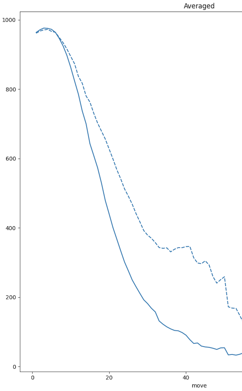 (The dashed line becomes a little bit chaotic past move 35, I think that’s because many games end before that, so after move 35 there is less data and thus the smoothing effect from averaging is not that strong)