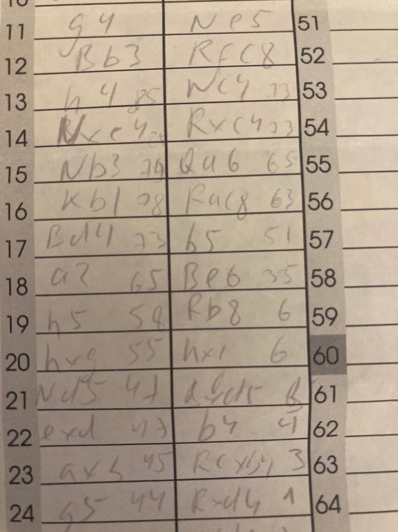Regarding writing time on scoresheets: I started doing it after I saw my opponent Romain doing it in Round 2 of La Plagne tournament. Here is my scoresheet from that game: