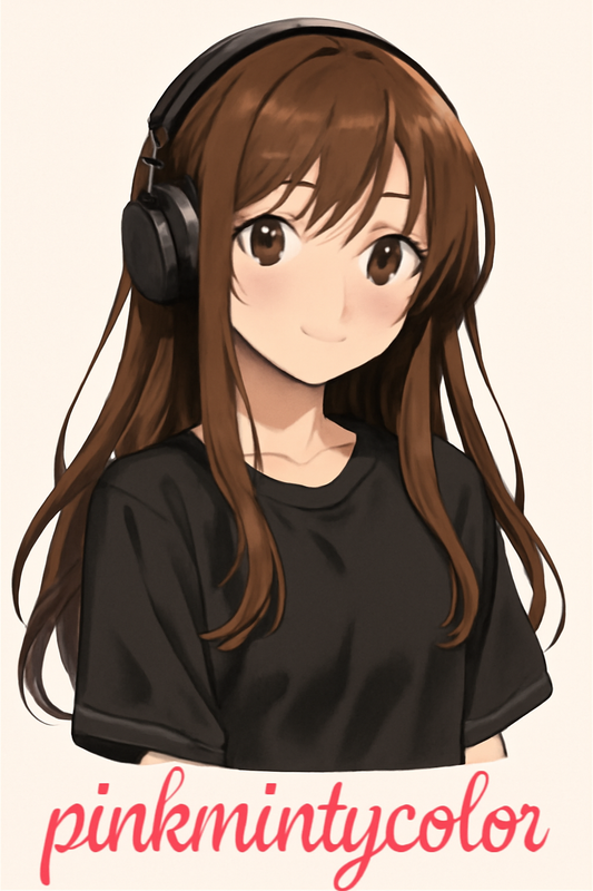 > an anime girl with casual black clothing, headphones, and long brown hair