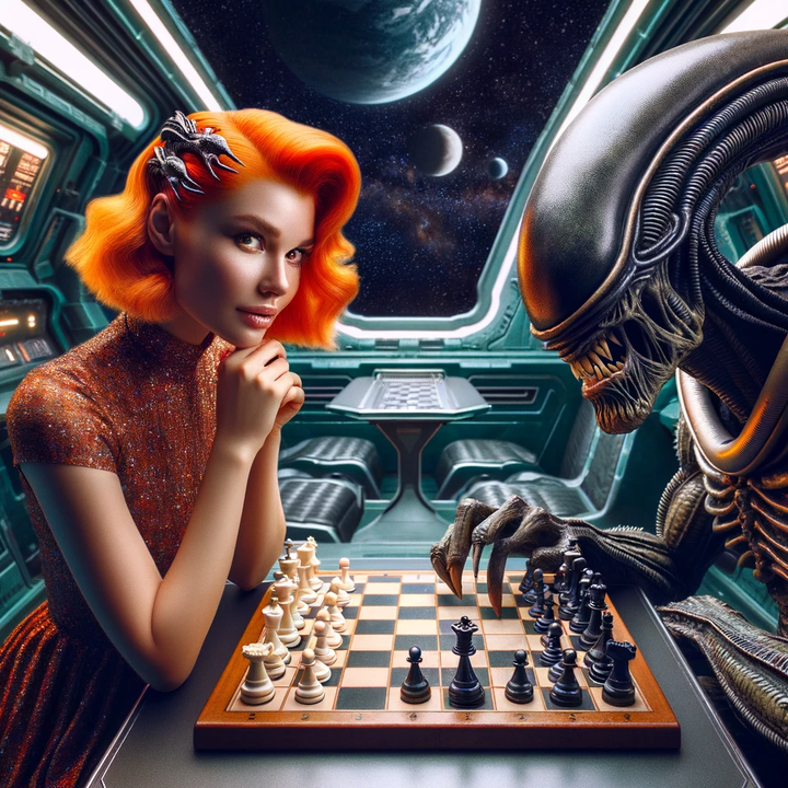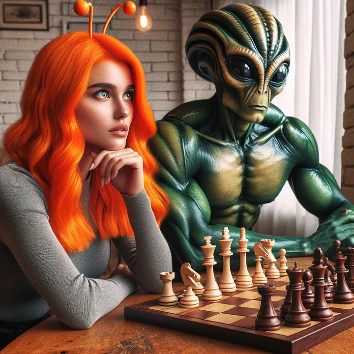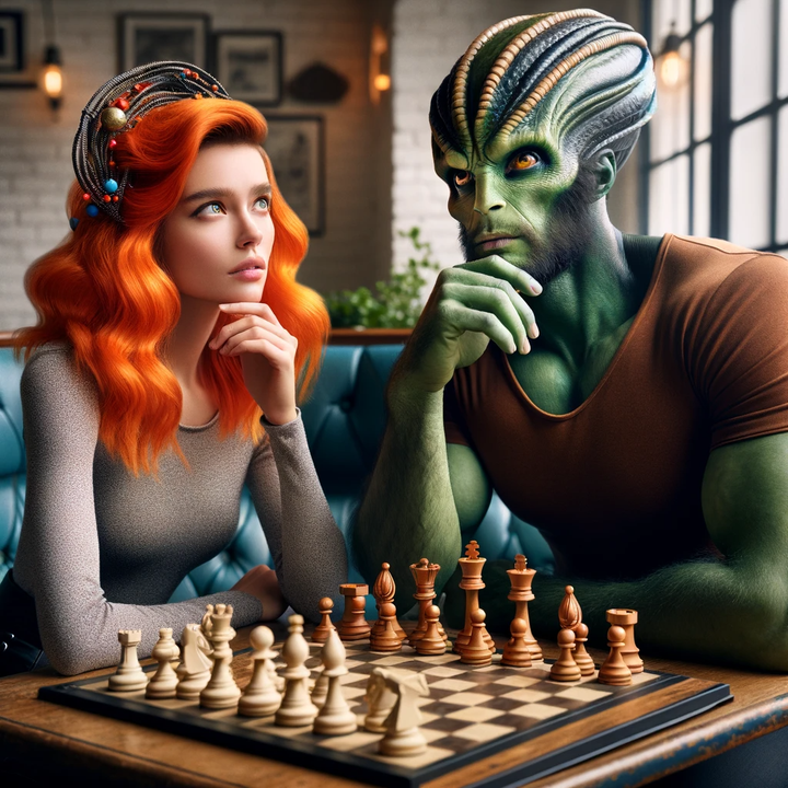 Here are the images of the young woman with bright orange hair playing chess with a masculine alien. The setting combines human and alien elements, creating a unique atmosphere for their intellectual game.