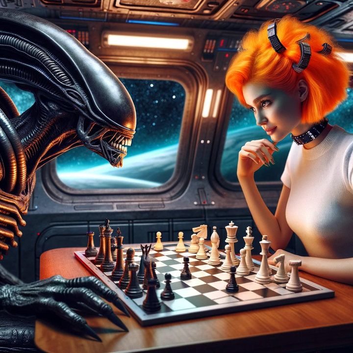 Here are the images depicting the young woman with bright orange hair playing chess against a scary, masculine alien inside a spaceship. The atmosphere captures the tension and focus of their game in this extraordinary setting.