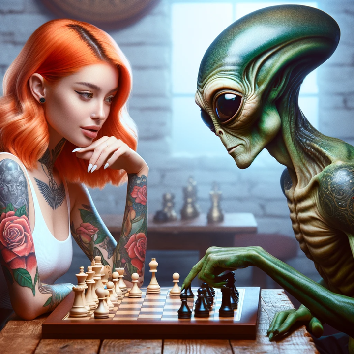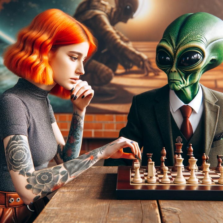 Here are the images of the young woman with a beautiful arm tattoo and bright orange hair, playing chess against an alien with a distinguished, intellectual appearance. The scene creatively merges human and alien elements in their game setting.