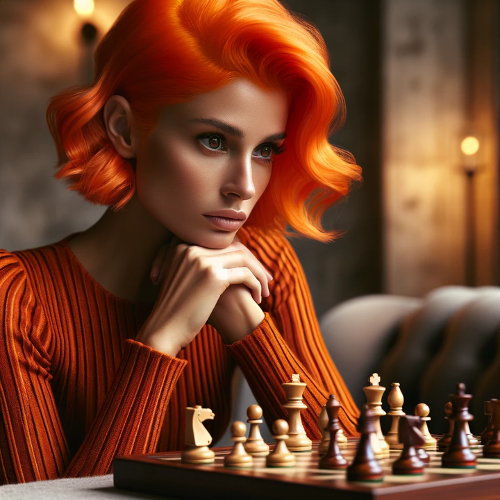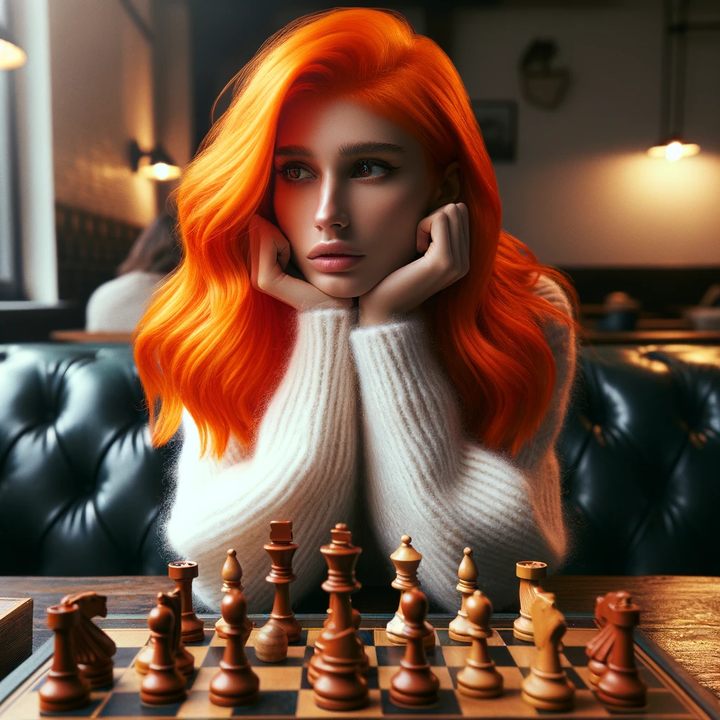 Создаем картинки на тему шахматной игры.Here are the images of the thoughtful young woman with bright orange hair, sitting at a chess table. The chess pieces are intricately woven into her hair, adding a unique touch to the scene.