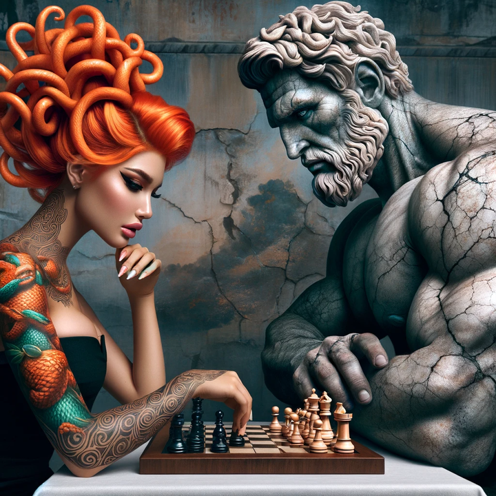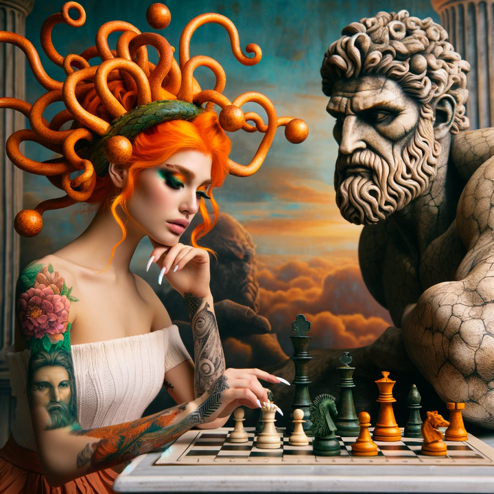Here are the images of the young woman with bright orange hair styled like Medusa's and a beautiful arm tattoo, playing chess against a masculine, ancient Titan figure. The setting is rich in mythical elements and portrays a dramatic scene.