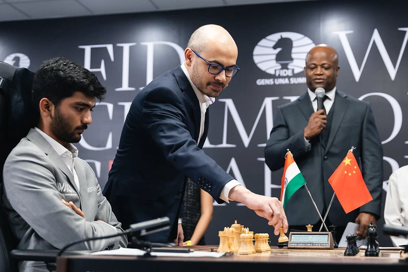 The first question of the day was how Gukesh would choose to start off with the White pieces. Any player vying for the world championship title could be considered a "universal player", so 1. e4, 1. d4, 1. c4, and 1. Nf3 were all on the cards. The ceremonial first move, conducted by world renowned DeepMind CEO Sir Demis Hassabis, after consultation with Gukesh, who himself has described his style as "universal", was 1. e4.