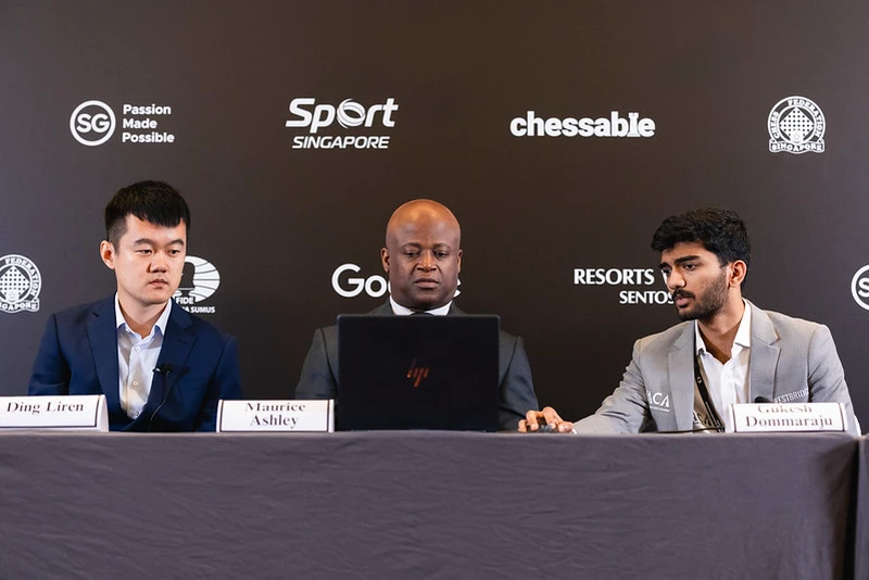 Ding mentioned that he hadn't won a classical game in a while, so it was good to get this victory in, but as objective and humble as he is, he mentioned that he missed two brilliant tactical resources for Gukesh, which he proceeded to show — Ding mentioned he was lucky to have won because he had missed those tactics initially, but intuition definitely plays a part in playing the correct move even when one does not necessarily see all the possible subtleties. Gukesh also mentioned that he had relied on the same tactical subtlety Ding mentioned, and he thought the position started slipping early on and especially more so after 18...Nb2!, which he "did not take seriously". Gukesh admitted he was a bit nervous heading into the game but calmed down as his opening surprise landed and he gained a big lead on the clock. Of course, Gukesh's composure and well-thought-out responses during the press conference were nothing short of commendable.