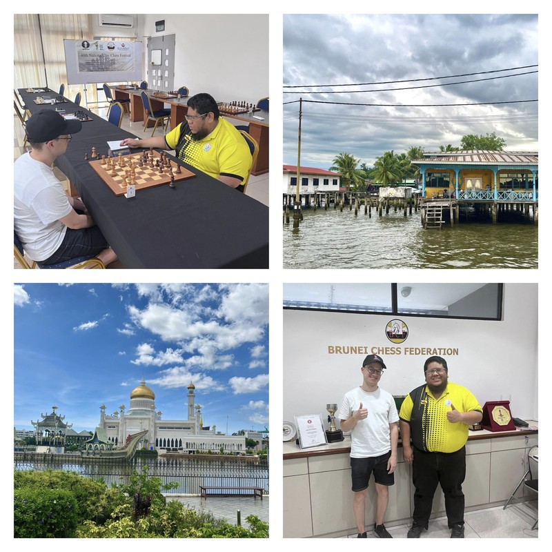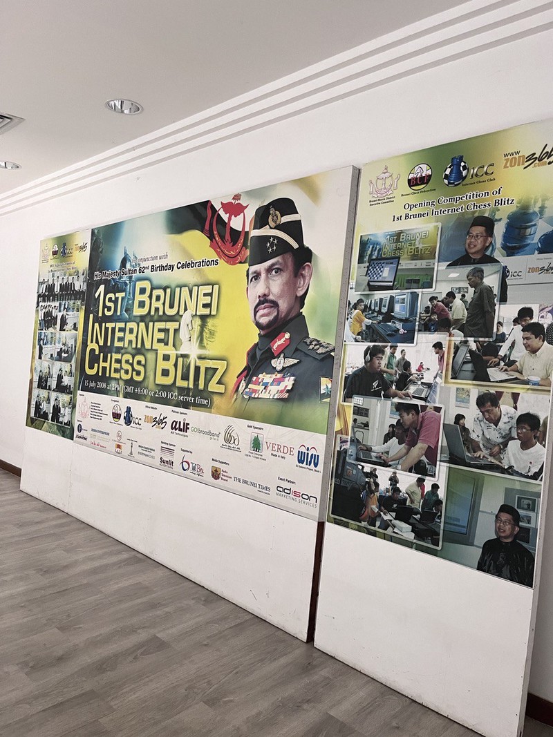 FIDE Master Aliuddin Azahari heads Brunei's only Chess Federation chess centre, which is located in the same building as the Brunei Darussalam Tennis Association between the airport and the city centre. On the other two pictures you can see the Omar Ali Saifuddien Mosque & Kampung Ayer, a prominent traditional settlement in Bandar Seri Begawan.